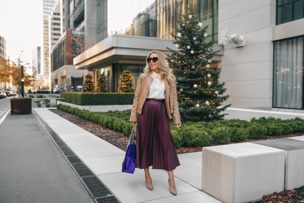 A pleated midi skirt in a rich jewel tone instantly feels festive without being over the top. Paired with a neutral blouse and jacket, it’s the perfect mix of polished and playful — chic enough for the office, yet celebratory for a night out.