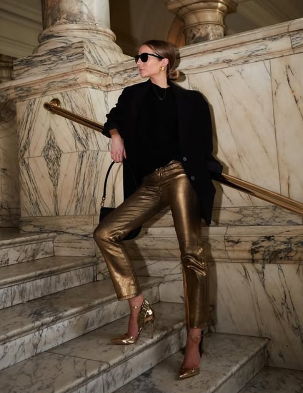 Yes, you can wear metallic pants to a work party. Tone them down with a classic black blouse or cashmere sweater. Add sleek pumps and you’re party-ready without looking too “club.”