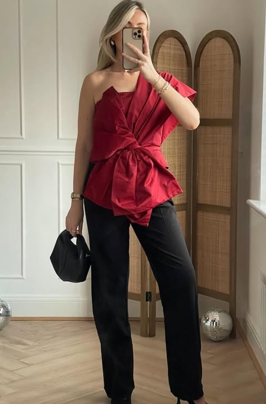 Velvet is one of the most festive fabrics you can wear, and this deep green top makes the perfect statement without being over the top. Paired with sleek black wide-leg trousers, it’s a chic and professional look that feels just right for a Christmas work party.