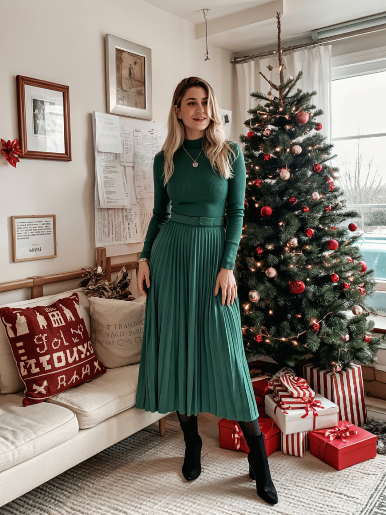 Nothing says holiday-ready like a monochrome outfit. This ribbed green dress with a pleated skirt feels both cozy and elegant, especially styled with black tights and ankle boots. It’s effortless, flattering, and a classy way to nod to the season.