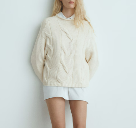 If you want cozy but classy, this is the one. The cable knit has that old-money, countryside charm — think firesides, warm lattes, and long walks. It looks rich because of its texture and weight. Choose one in cream, oatmeal, or grey and wear it with simple gold jewelry or a wool coat.