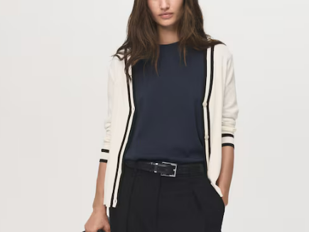 This one is for when you want something simple that still stands out. A contrast trim (like black on cream or navy on white) gives off that polished, preppy feel that never goes out of style. It’s very “old money off-duty.” You can wear it with a pleated skirt, straight jeans, or over your shoulders with a crisp white shirt.