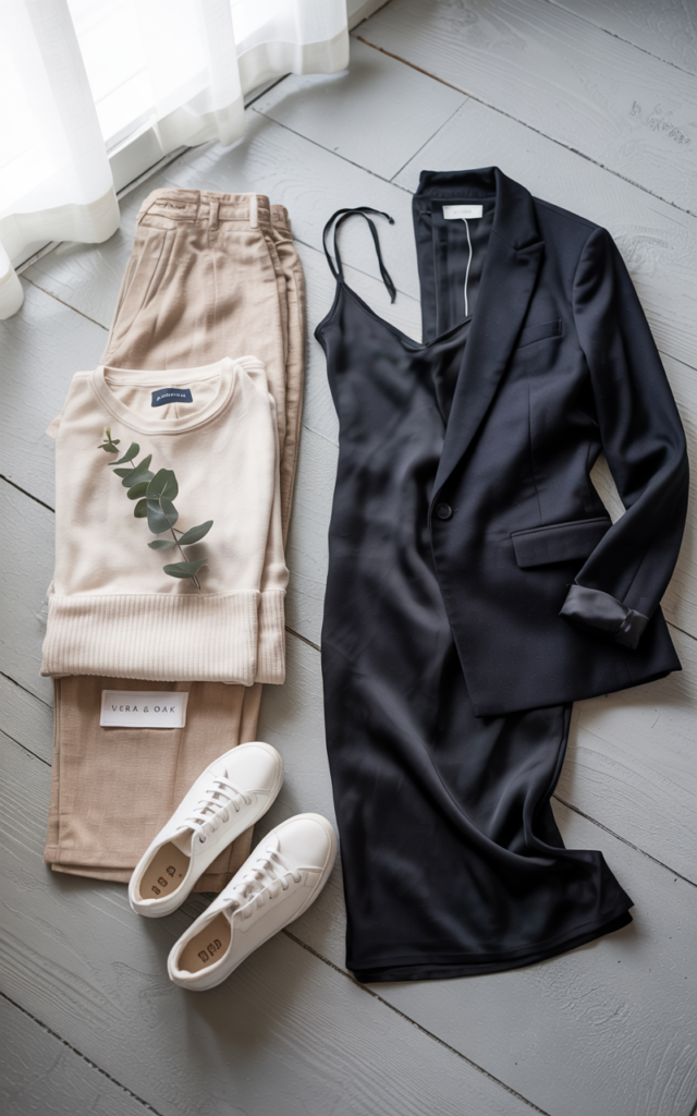 👉 Example: A starter capsule could look like this — two pairs of jeans, one black trouser, one skirt, a few t-shirts (white, grey, striped), a blouse, two jumpers, a cardigan, a blazer, a trench coat, two dresses, white sneakers, black flats, and ankle boots. That’s already about 20 pieces, and you could create dozens of outfits with just that mix.